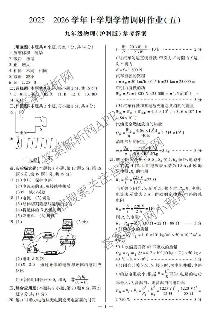 - (九年级)河南省周口市2025-2026学年上学期学情调研作业(五)物理(沪科版)答案