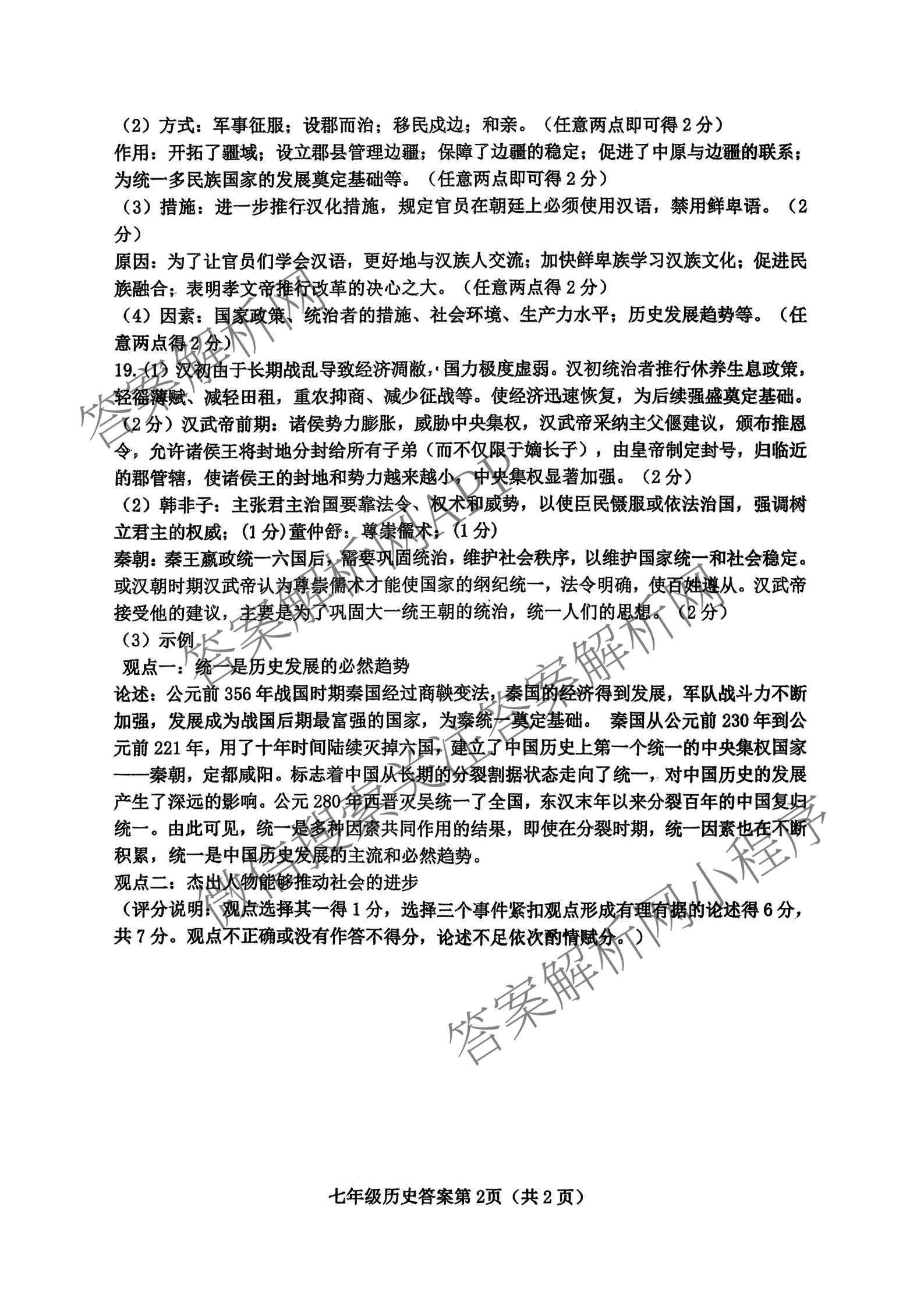 - [七年级]太谷区2025~2026学年度第一学期期末质量检测试题(卷)历史答案