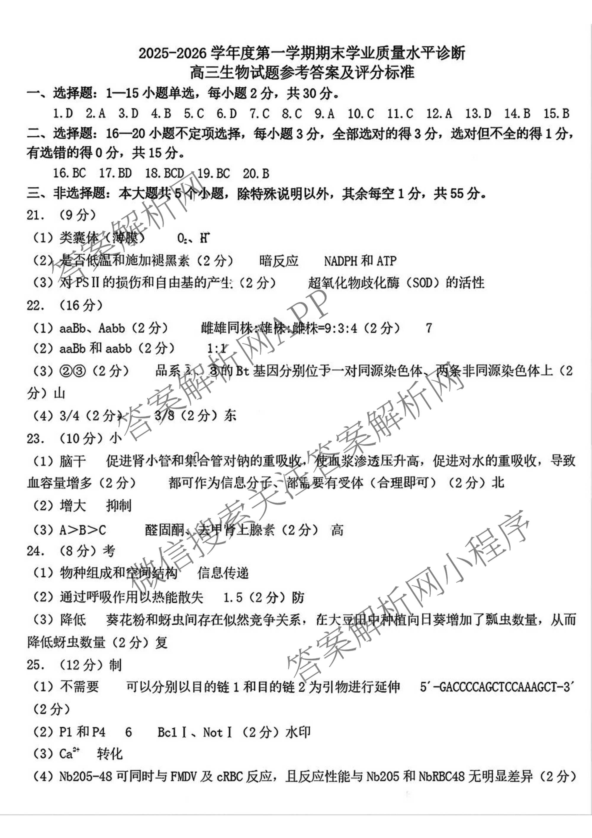 烟台市2025-2026学年度第一学期期末学业水平诊断高三生物答案,目前衡水金卷先享题答案网已经汇总了烟台市2025-2026学年度第一学期期末学业水平诊断高三生物答案的各科答案和试卷,获取更多地方模拟答案解析,请在关注本站。