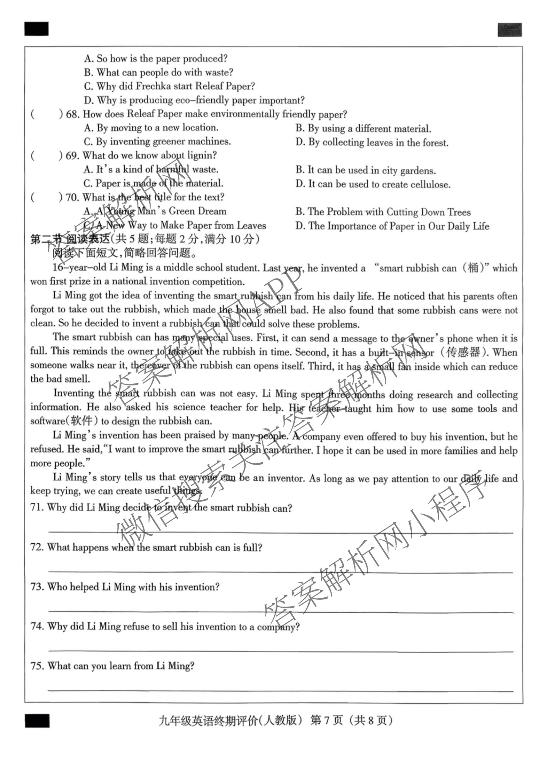 - [九年级]河北省2025~2026学年第一学期学业水平终期评价英语(仁爱版)答案