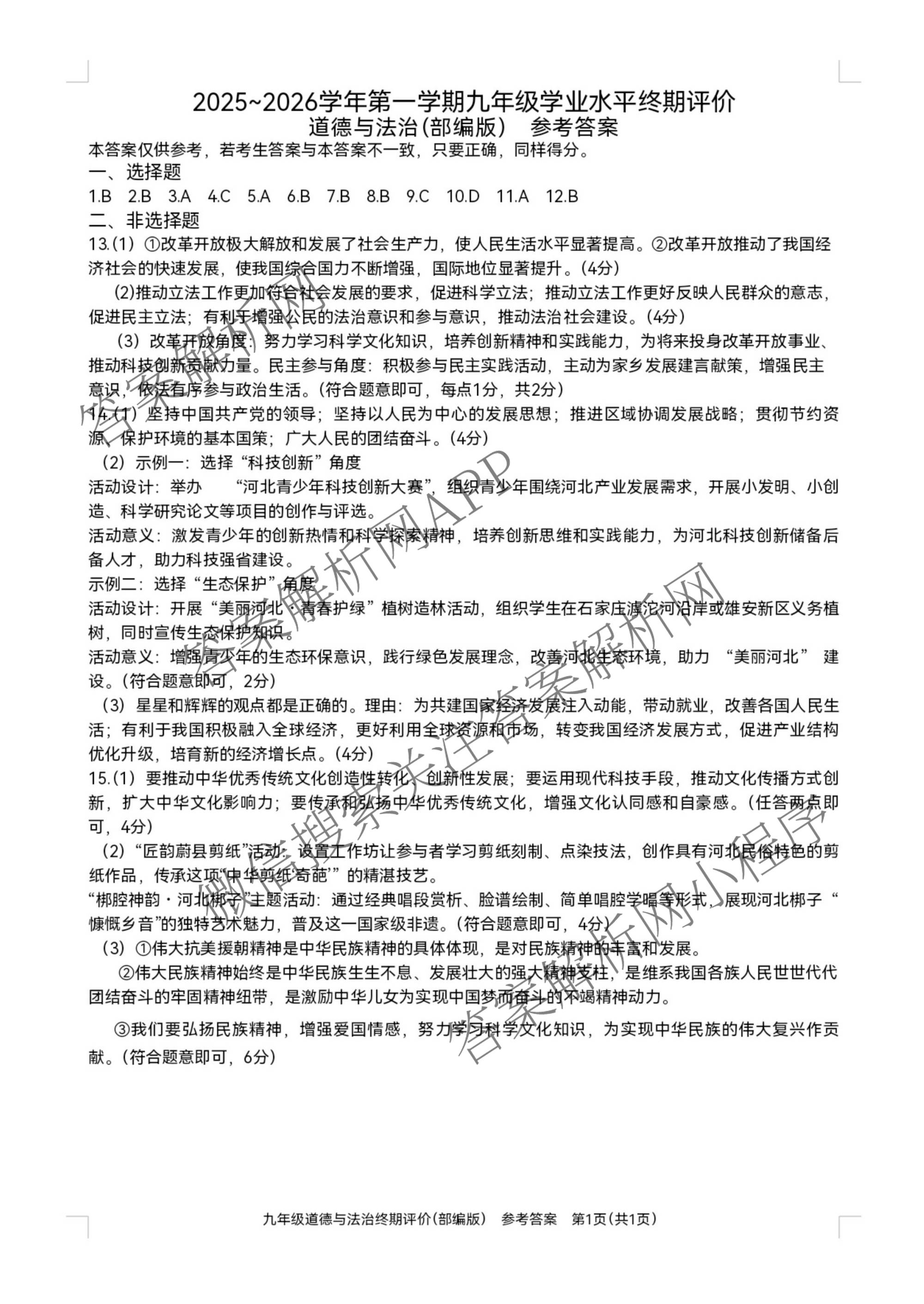 - 2025~2026河北省学年第一学期[九年级]学业水平终期评价道德与法治(部编版)答案
