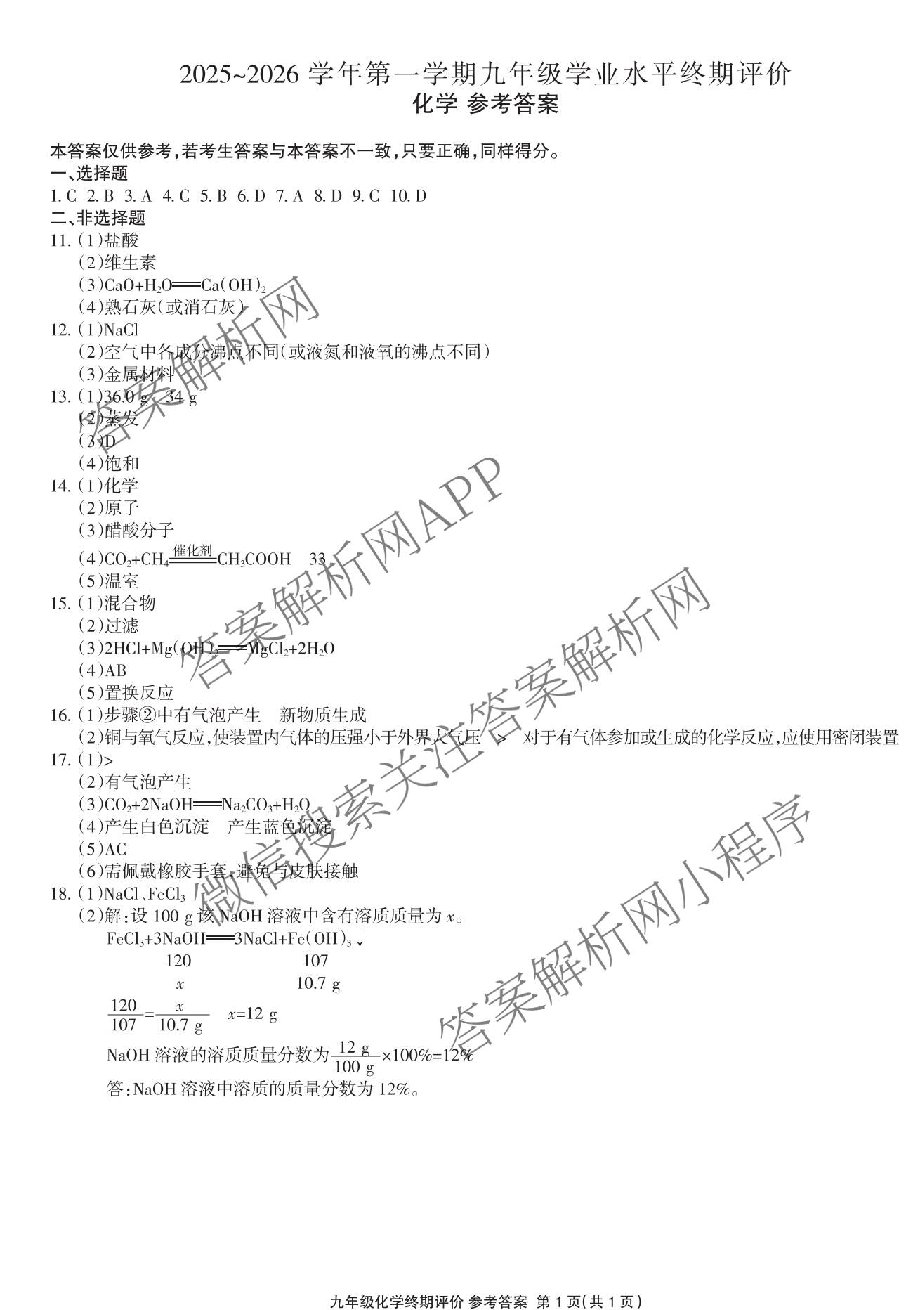 - 2025~2026九年级河北省学年第一学期学业水平终期评价化学答案