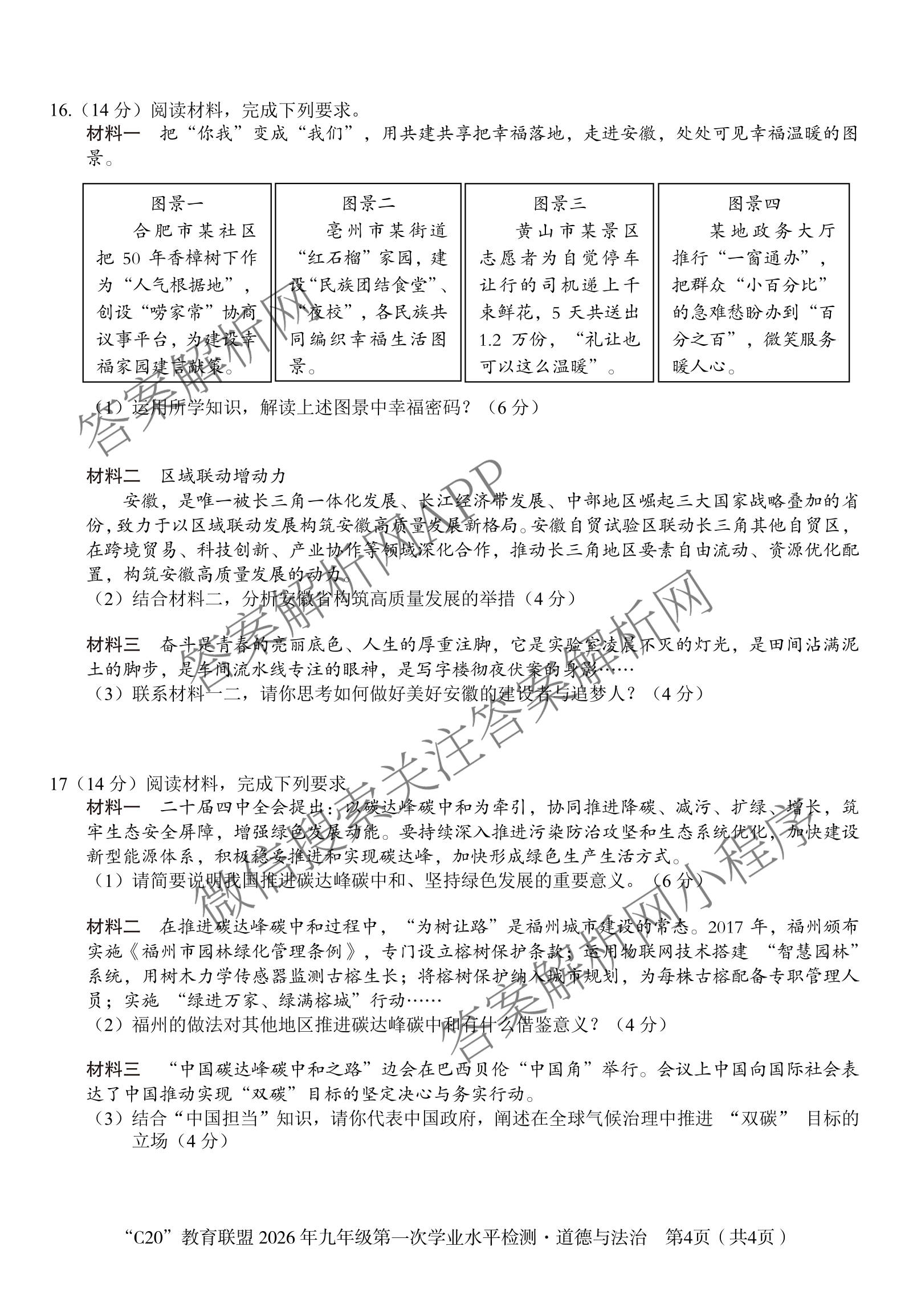 - 安徽省"C20"教育联盟2026年(九年级)第一次学业水平检测道德与法治试题