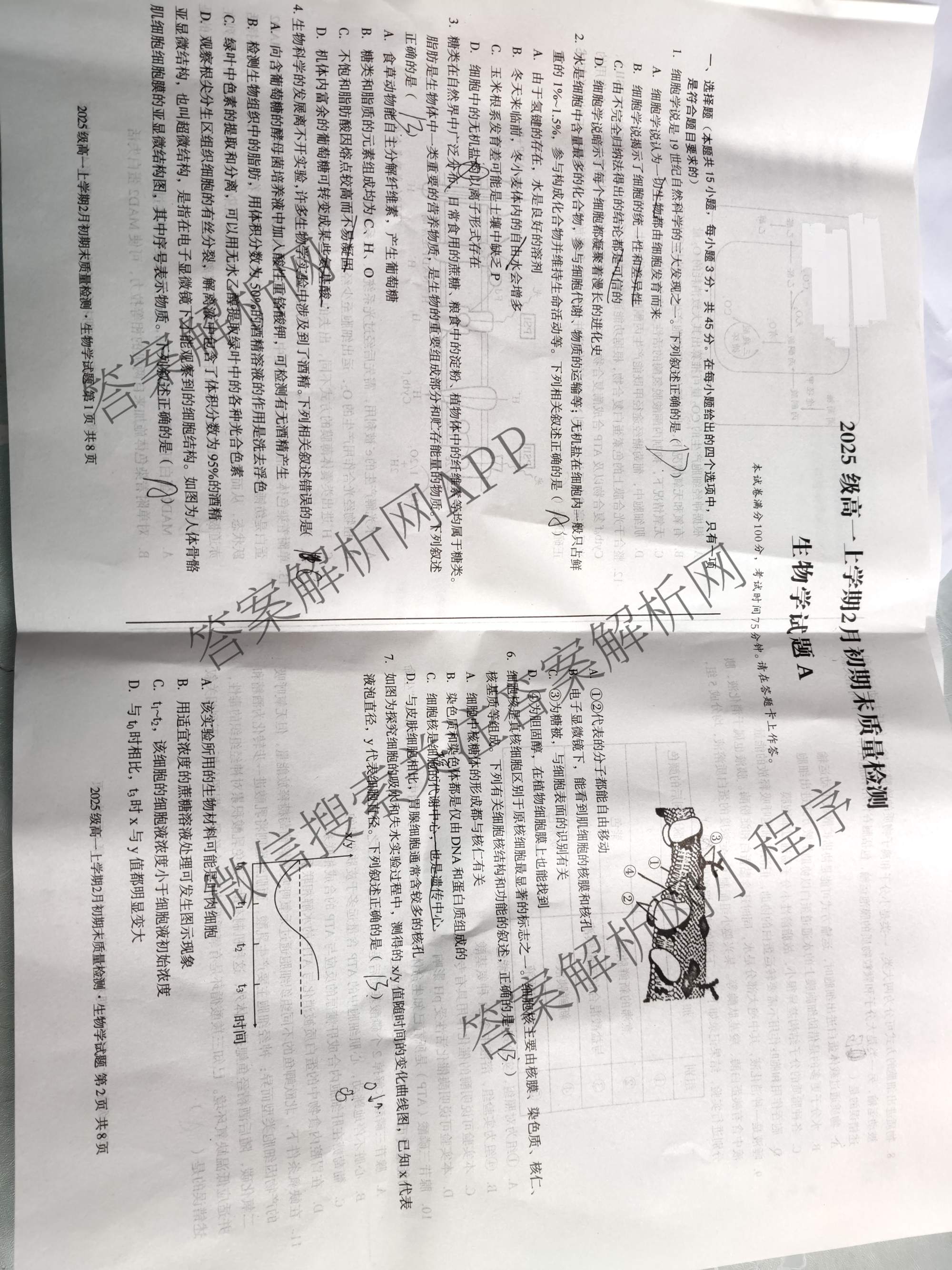 - (高一)安徽省2025级上学期2月初期末质量检测生物(A)试题