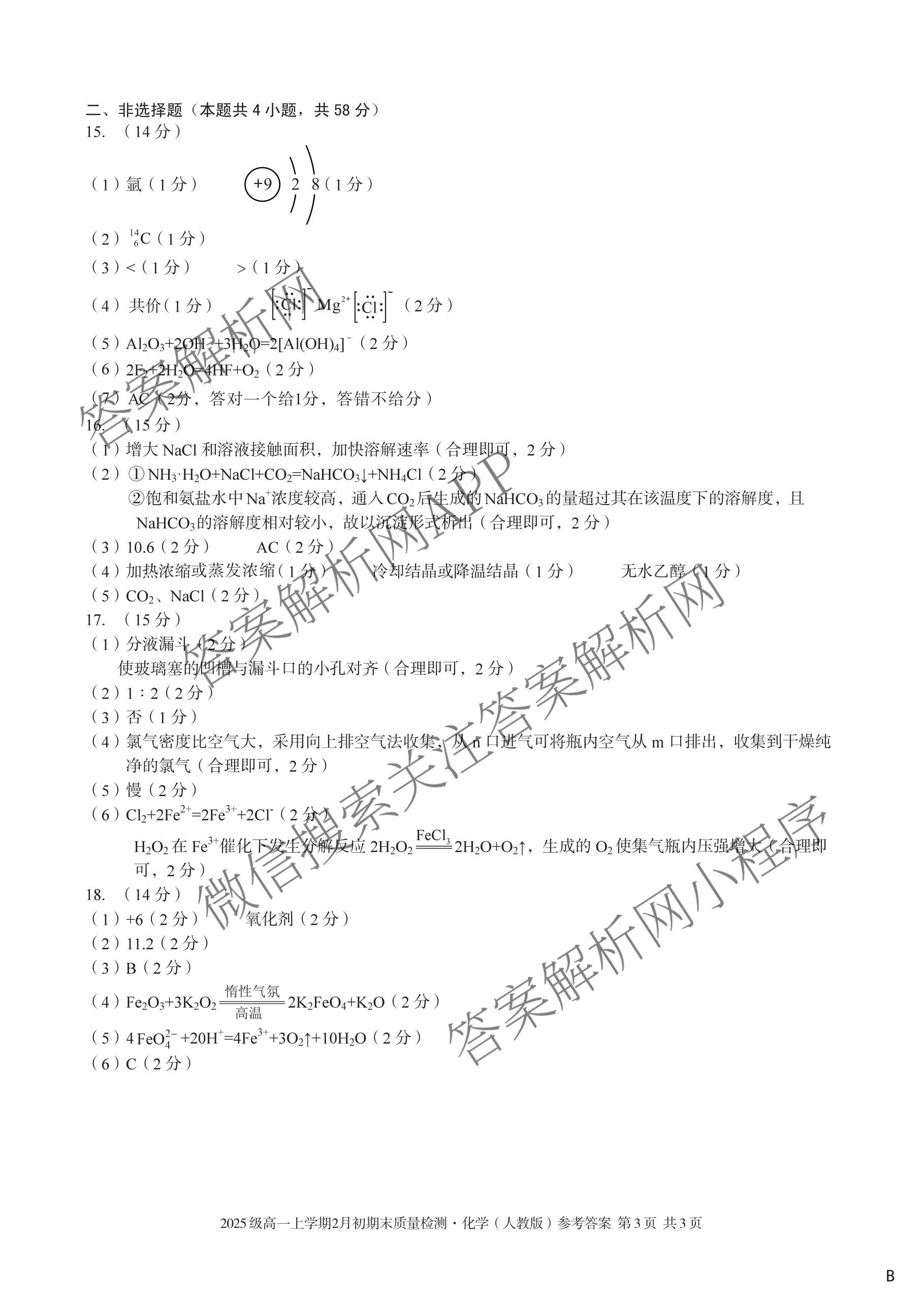 - 高一安徽省2025级上学期2月初期末质量检测化学(人教版B)答案
