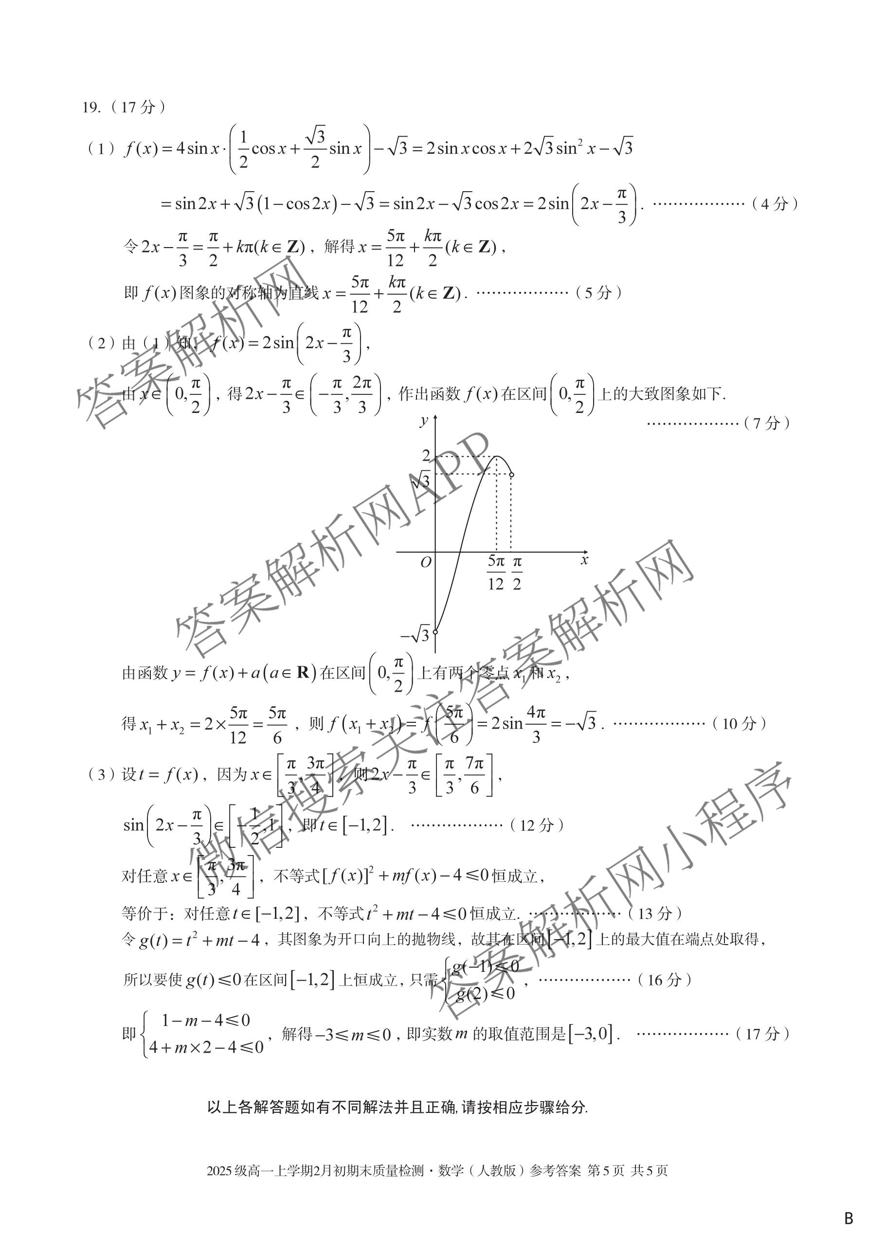 安徽省2025级[高一]上学期2月初期末质量检测数学(试题B 人教A版)答案