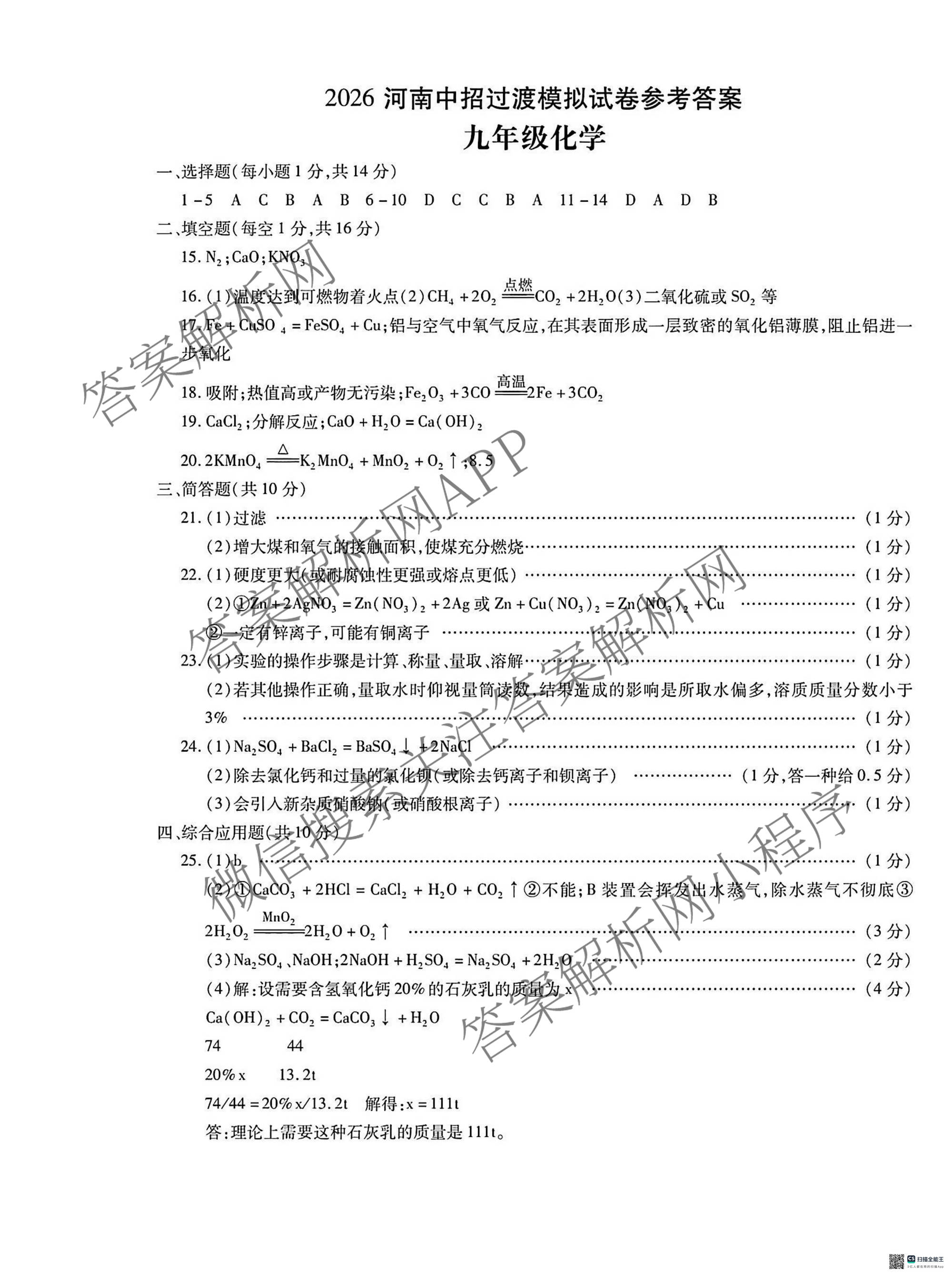 - [九年级]2026河南中招过渡模拟试卷(2月)化学答案