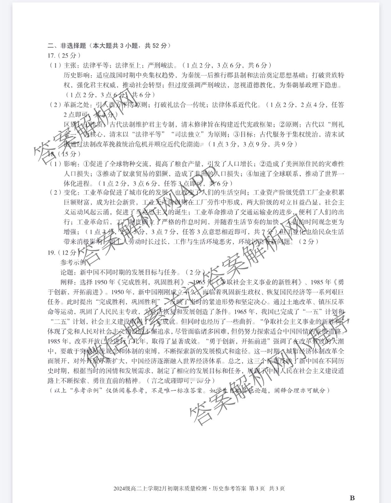 - 高二安徽省2024级上学期2月初期末质量检测历史(B卷)答案