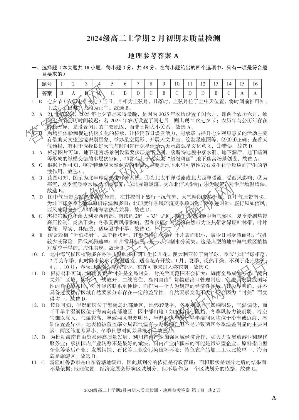 安徽省2024级[高二]上学期2月初期末质量检测地理(A)答案