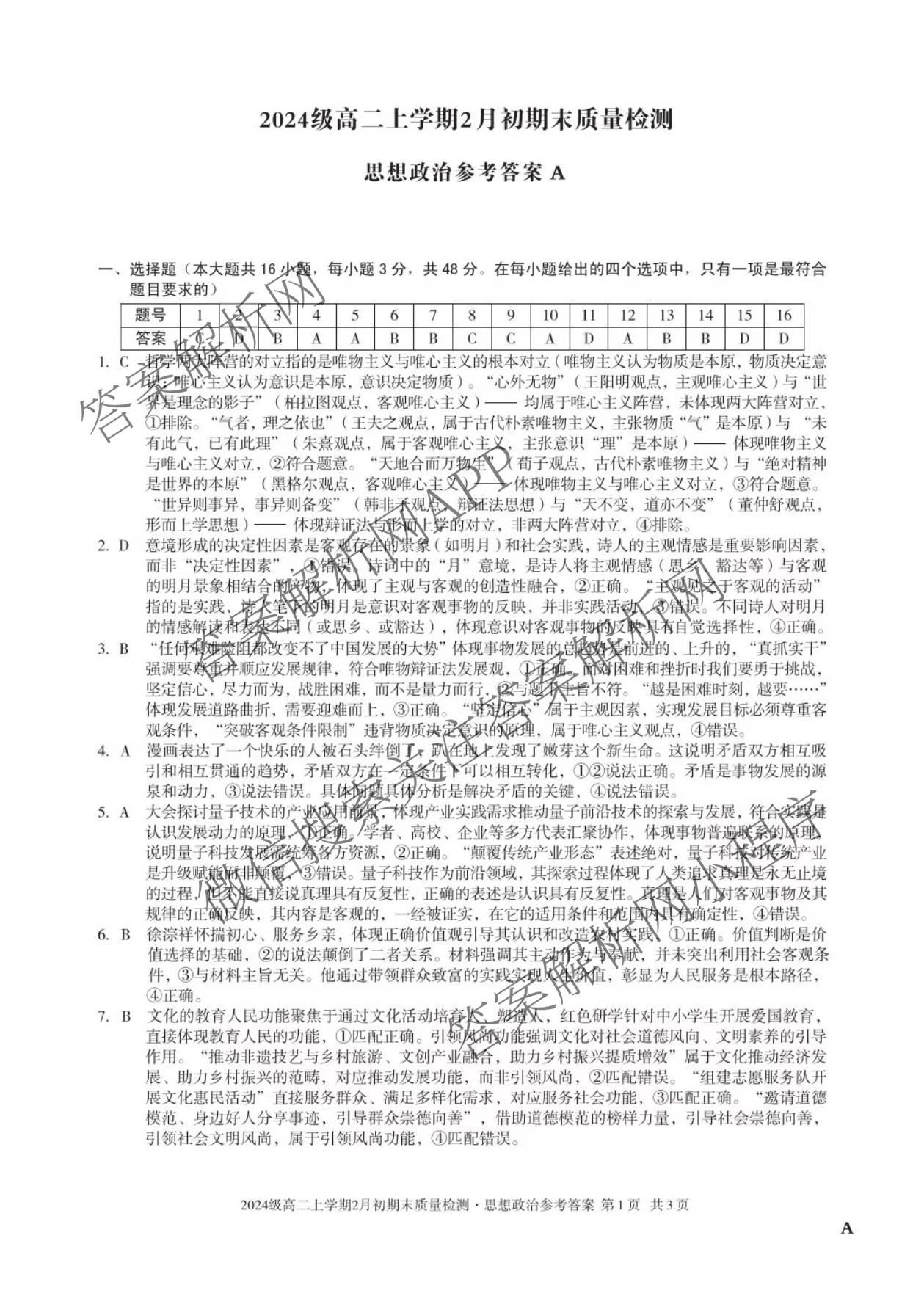 - 安徽省2024级(高二)上学期2月初期末质量检测政治(A)答案