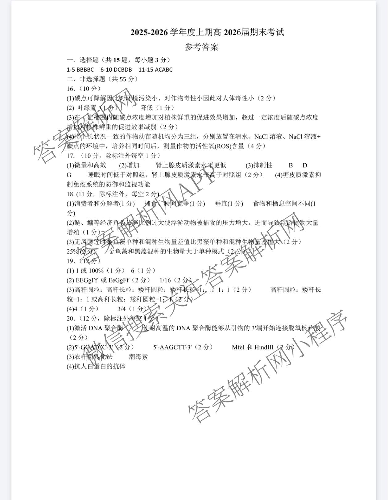 成都七中2025-2026学年度上期高2026届期末考试高三(02.06)生物答案,目前衡水金卷先享题答案网已经汇总了成都七中2025-2026学年度上期高2026届期末考试高三(02.06)生物答案的各科答案和试卷,获取更多地方模拟答案解析,请在关注本站。